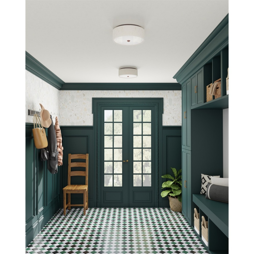 The exterior of the shade of the Tyrone Flush Mount is wrapped in recycled paper that has been twisted like braided hair. The paper is painted white to blend with the white diffuser affixed to this ivory flush mount. The wrought iron ceiling mount and finial nicely contrast the crispness of this design. The Tyrone is fitted with integrated LED technology.